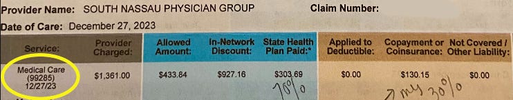 She’s covered by the North Carolina State Health Plan, administered by Blue Cross Blue Shield at the time. The state paid $824.65, and the family paid nearly $1,700 for the visit.