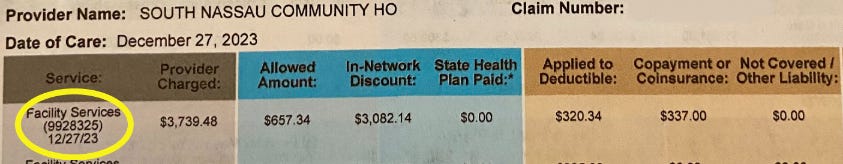 “She saw about six or seven people over five-and-a-half hours… she was in agony,” Sam recalled. Claims show charges for labs, radiology (a brain CT, chest X-ray, and an EKG), medication, the ER, a medical group, and a physician group. The tests were important to rule out serious diagnoses including a heart attack, aneurysm or stroke.